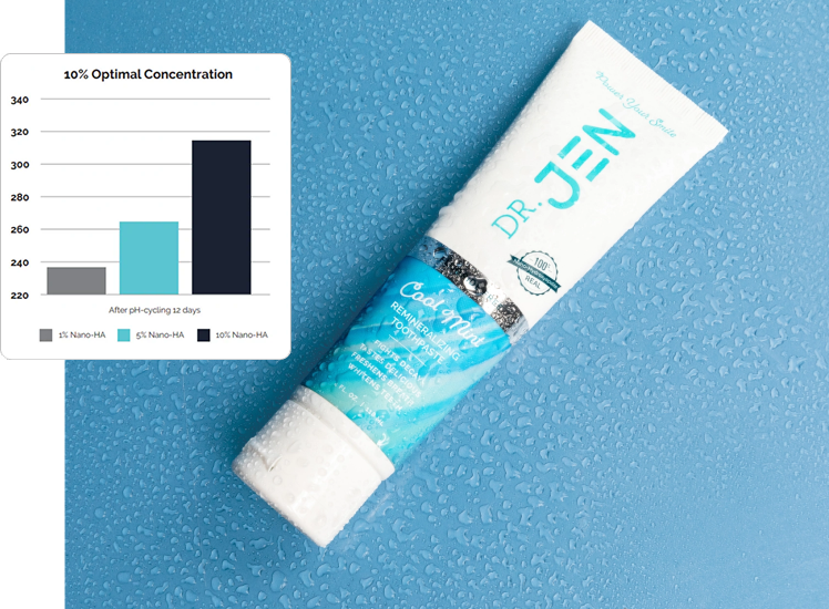 For optimal protection and remineralizng, studies support 10% concentrations of nano hydroxyapatite as the optimal level. Dr. Jen's uses premium nano Hydroxyapatite at 10% levels. We like to call that The 10% Difference.