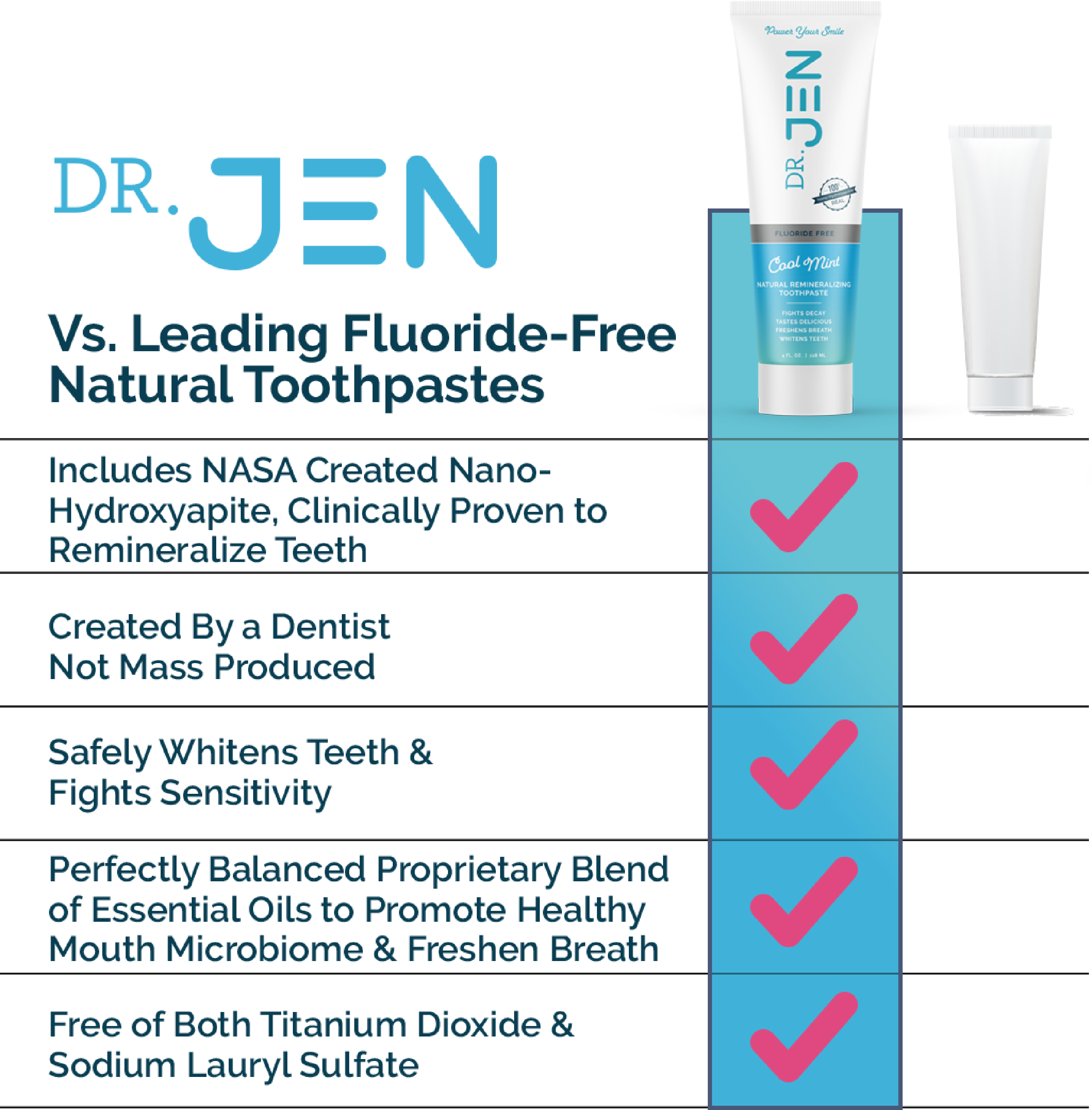 You'd think that all natural toothpastes would be good for your teeth, but they are not. Dr. Jen’s toothpaste brings together all-natural ingredients, sustainable and biodegradable materials, as well as a proven remineralizer so it tastes good, feels good and fights decay.